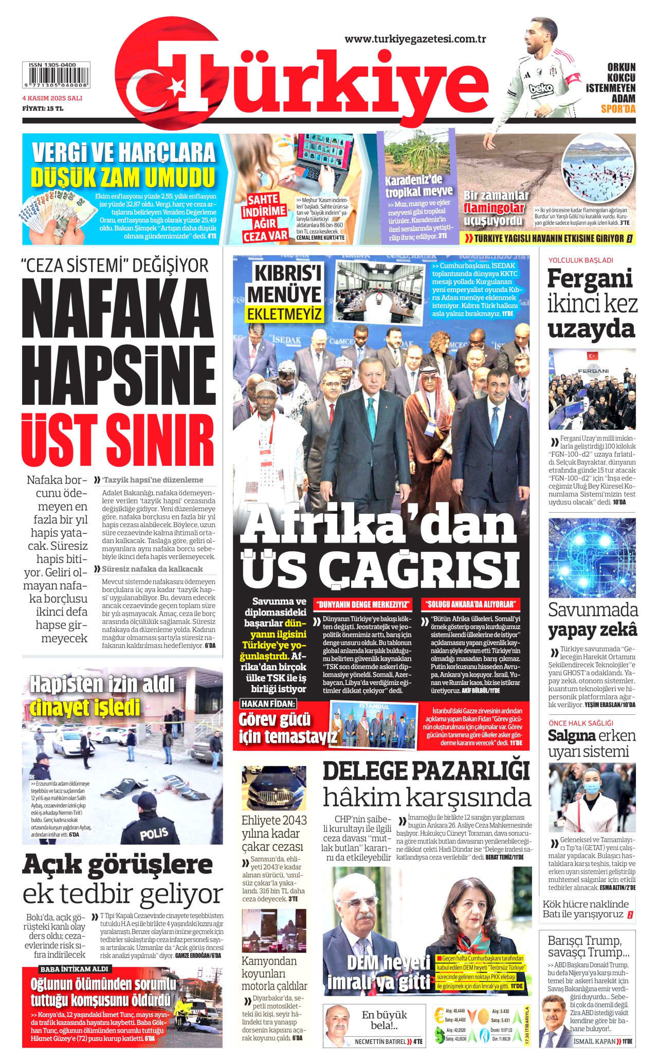 TÜRKİYE GAZETESİ Gazetesi 03 Kasım 2025, Pazartesi Günü Manşeti